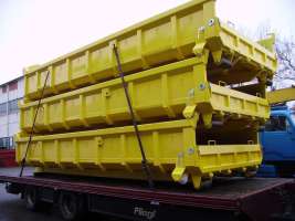 in der Standardausführung sind vor allem zum Sammeln und Transport von Bauschutt bestimmt. Sie haben einen großen Vorteil – es ist möglich 5 Stück pro LKW zuliefern. Die Behälter werden serienmäßig mit abklappbarer, zweimal gefederter Klappe geliefert. Die Klappe ist zum überfahren mit einem Bagger geeignet.
